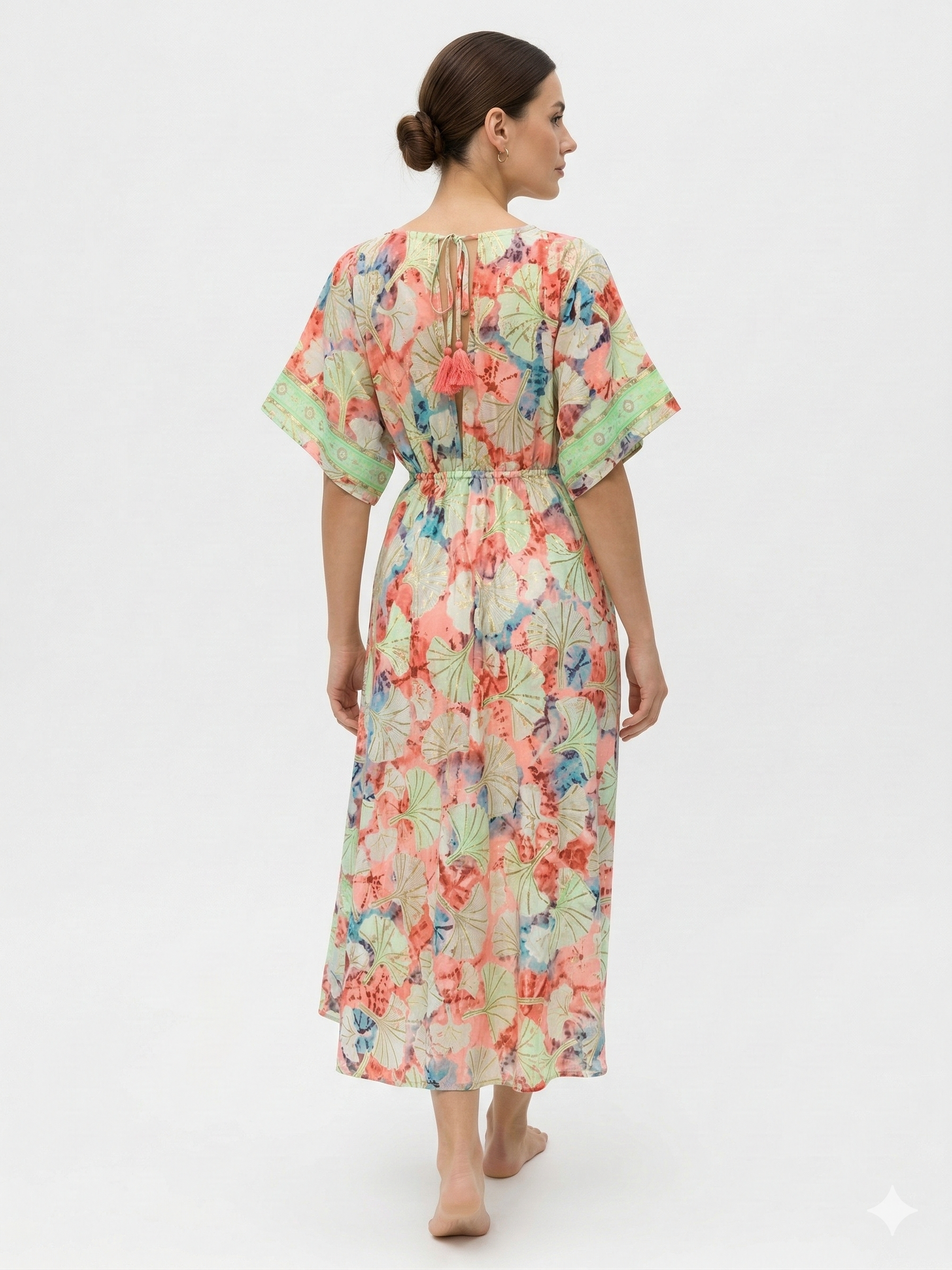 Nuestro vestido está confeccionado en seda hindú de alta gama100% natural que regula tu temperatura corporal, te mantiene fresca bajo el sol intenso y deja tu piel respirando.